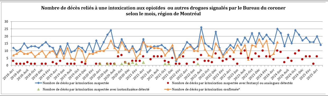 Les causes décès sont établies par une investigation complète du coroner. Les décès intentionnels sont exclus. Les rapports d’investigation pouvant prendre presque 12 mois à être complétés, le nombre de décès par intoxication confirmée est présenté jusqu'à un maximum de douze mois précédant le dernier mois courant.