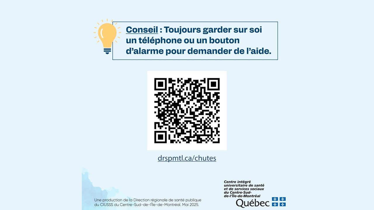 Remplissez ce questionnaire (FR / EN) pour vérifier si vous êtes à risque de faire une chute. Au besoin, discutez-en avec votre médecin ou un autre professionnel de la santé.