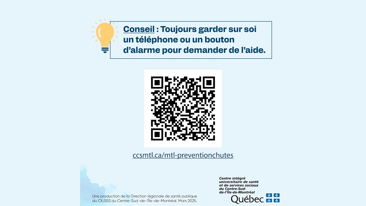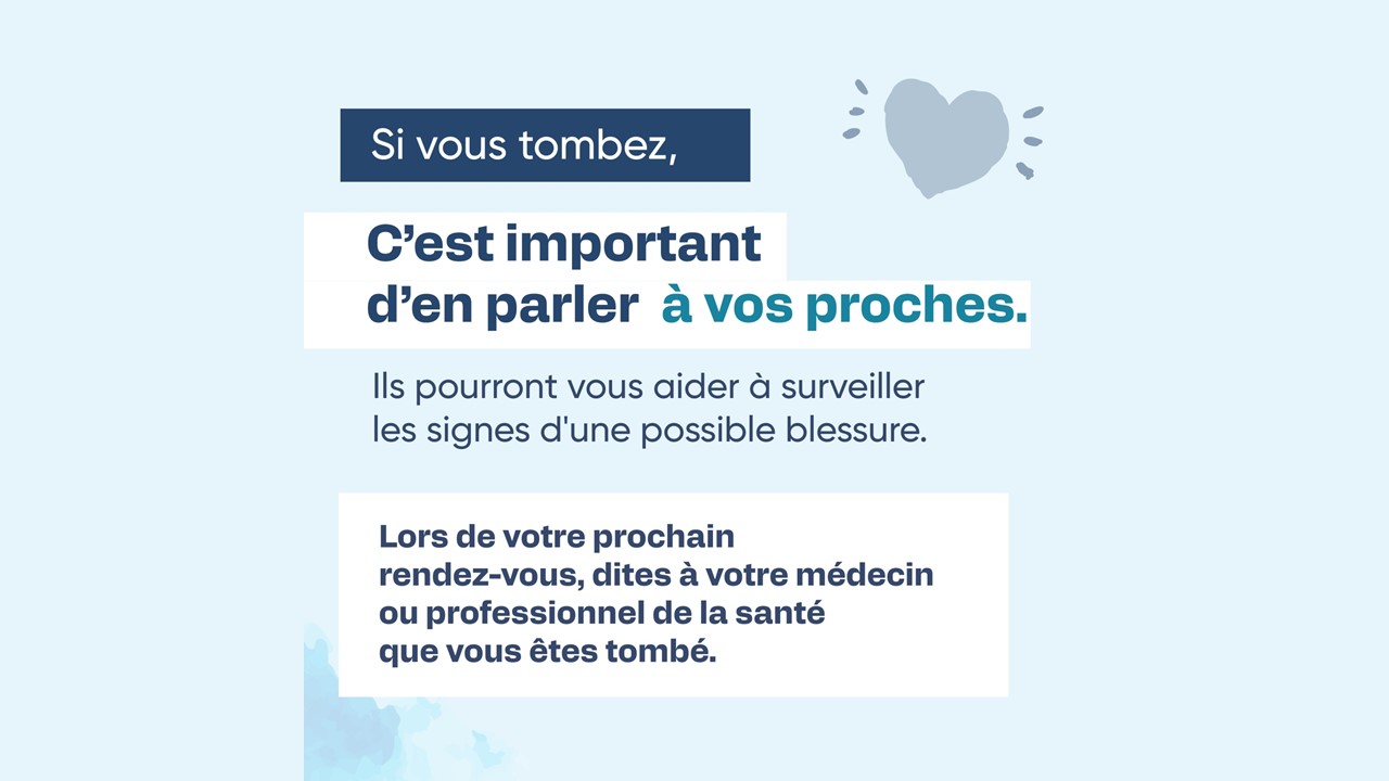 Remplissez ce questionnaire (FR / EN) pour vérifier si vous êtes à risque de faire une chute. Au besoin, discutez-en avec votre médecin ou un autre professionnel de la santé.